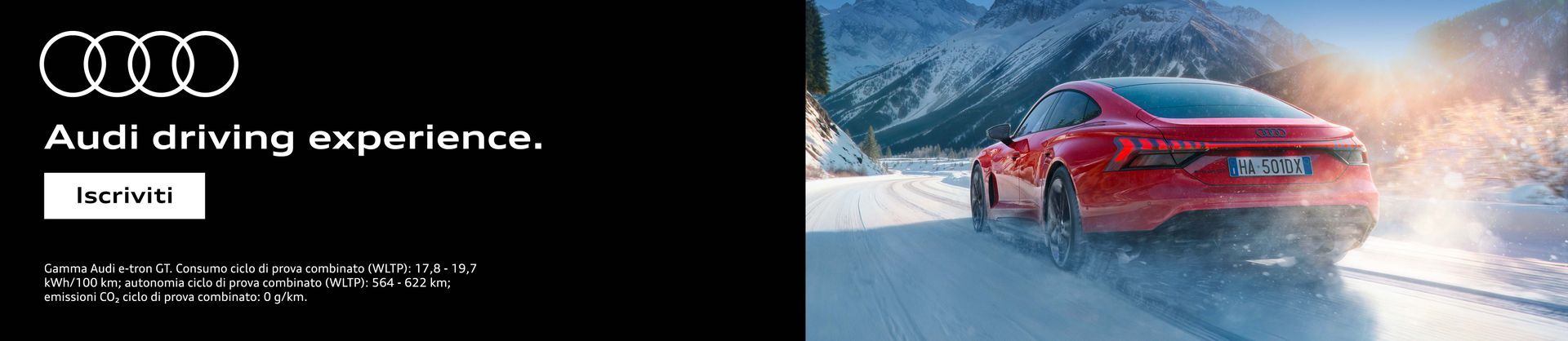 Iscriviti all’evento del 17-18 e 24-25 marzo 2026 e del 7-8 aprile 2026 su https://myaudi.it/it/audi-driving-experience/the-audi-days-of-extensive-driving-cortina-d-ampezzo/